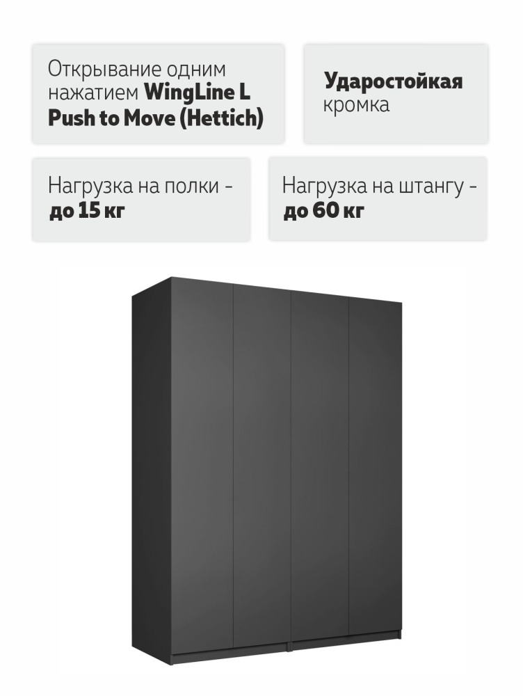Система из двух шкафов Локер со складным механизмом открывания WingLine L Push to Move — это комфортное хранение вещей и эргономичная организация пространства. Благодаря надежным полкодержателям - штифтам, полки шкафа могут выдерживать до 15 кг. Шкаф оснащен долговечной, ударостойкой кромкой ПВХ, которая защищает его торцы от сколов и повреждений. Складная система дверей WingLine L с механизмом Push to Move позволяет открыть шкаф всего одним нажатием на фасад. Плавный и тихий ход, надежность в эксплуатации и максимальное складывание дверей – это инновационный подход к организации порядка. Данная система обеспечивает панорамный эффект и свободу в дизайне.