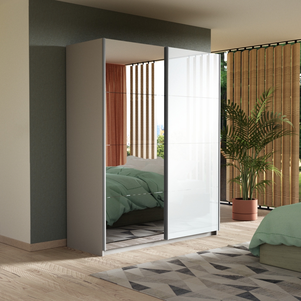 Шкаф-купе Прайм, 2дв. Зеркало/Белый Глянец/доводчики, 140х57х230, Белый снег